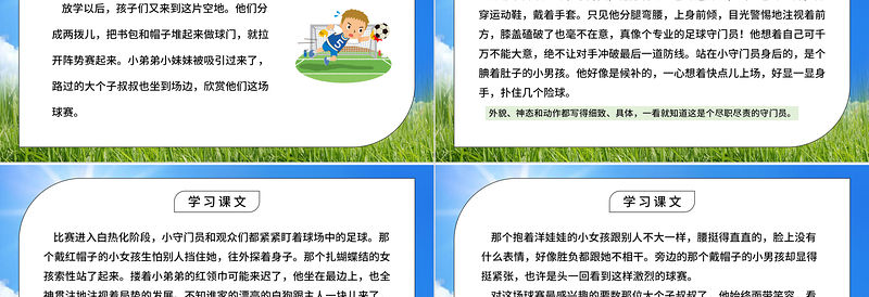 如,本文在寫小守門員時,抓住了他的外貌和動作,來突出他“真像個專業(yè)的足球守門員”?!吧碇钏{色的運動衣,淺藍色的短褲,腳穿運動鞋,戴著手套”,這一身裝扮,就十分像一個專業(yè)運動員了;“分腿彎腰,上身前傾,目光警惕地注視著前方”,這一系列動作,正是一個專業(yè)守門員在賽場上的動作。無論是裝扮還是動作上,給人的感覺就像是一個專業(yè)的守門員,認真專注,給人留下了深刻的印象。課文小結(jié)