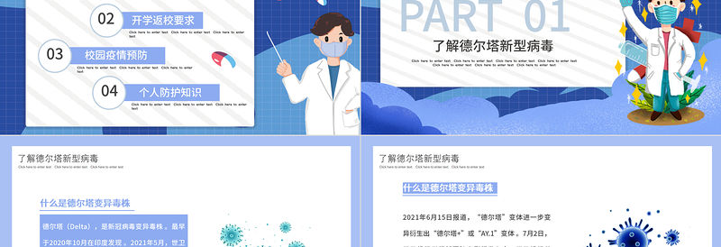 了解德爾塔新型病毒01Click here to enter text Click here to enter text Click here to enter text 開學(xué)返校要求02Click here to enter text Click here to enter text Click here to enter text 校園疫情預(yù)防03Click here to enter text Click here to enter text Click here to enter text 個(gè)人防護(hù)知識(shí)04Click here to enter text Click here to enter text Click here to enter text CONTENTS