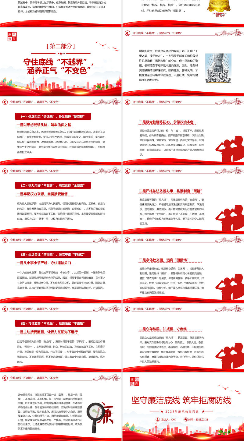 今天,我們齊聚一堂,共同開展一場以“堅守廉潔底線,筑牢拒腐防線”為主題的廉政教育黨課。在座的各位,都是機關單位的中流砥柱,不僅肩負著黨和人民的重托,更承載著風清氣正的政治責任。廉潔從政,不僅是黨性錘煉的“試金石”,更是職業生涯穩健前行的“安全繩”。在新時代新征程上,面對依然復雜嚴峻的反腐敗斗爭形勢,唯有扣緊廉政教育的“緊箍咒”,錘煉拒腐防變的“硬功夫”,方能筑牢思想防線,涵養廉潔自律的政治自覺,共同營造風清氣正的機關生態。前 言 PREFACE