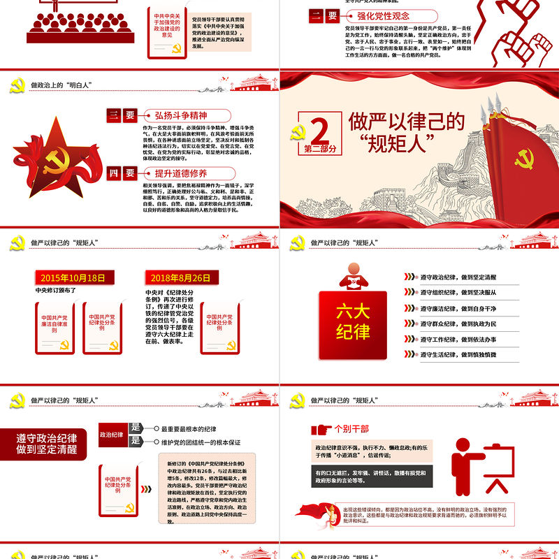 做嚴以律己的“規(guī)矩人” 六大紀律遵守政治紀律,做到堅定清醒遵守組織紀律,做到堅決服從遵守廉潔紀律,做到自身干凈遵守群眾紀律,做到執(zhí)政為民遵守工作紀律,做到依法辦事遵守生活紀律,做到慎獨慎微