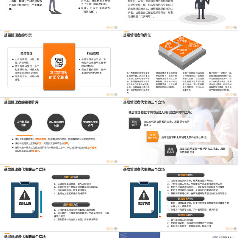基層管理者代表的三個(gè)立場(chǎng)面對(duì) 部下應(yīng)站在代表執(zhí)行者的立場(chǎng),用領(lǐng)導(dǎo)者的聲音說(shuō)話面對(duì) 直接上級(jí)應(yīng)站在部下和上級(jí)輔助人員的立場(chǎng)上講話。面對(duì) 更高層應(yīng)站在反映基層一級(jí)呼聲的立場(chǎng)上,用部下的聲音說(shuō)話基層管理者面對(duì)不同階層人員的應(yīng)當(dāng)有不同立場(chǎng):