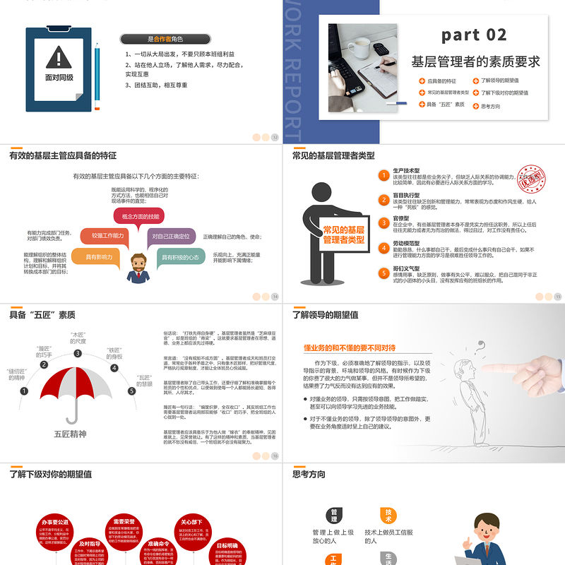 WORK REPORTpart 02基層管理者的素質(zhì)要求應(yīng)具備的特征常見(jiàn)的基層管理者類(lèi)型具備“五匠”素質(zhì)了解領(lǐng)導(dǎo)的期望值了解下級(jí)對(duì)你的期望值思考方向