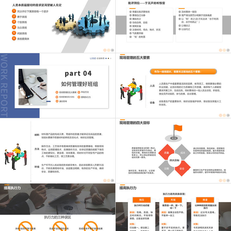 WORK REPORTpart 04如何管理好班組現(xiàn)場(chǎng)管理的五大要素現(xiàn)場(chǎng)管理的四大目標(biāo)早會(huì)方法提高執(zhí)行力請(qǐng)你思考