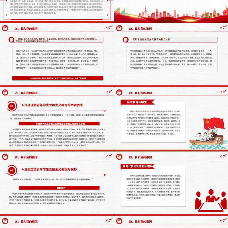 愛國,是人世間最自然、最樸素,也是最深層、最持久的情感。愛國主義是中華民族的民族心、民族魂,是中華民族最主要的精神財富。黨的十八大以來,以習近平同志為核心的黨中央高度重視青少年的愛國主義教育,固本培元、凝心鑄魂,作出一系列重要部署,推動愛國主義教育取得顯著成效。在2018年9月10日的全國教育大會上,習近平總書記強調:“要在厚植愛國主義情懷上下功夫,讓愛國主義精神在學生心中牢牢扎根,教育引導學生熱愛和擁護中國共產黨,立志聽黨話、跟黨走,立志扎根人民、奉獻國家?!敝泄仓醒?、國務院印發的《新時代愛國主義教育實施綱要》指出,“新時代愛國主義教育要面向全體人民、聚焦青少年”“培養社會主義建設者和接班人,首先要培養學生的愛國情懷”。四、我和我的祖國