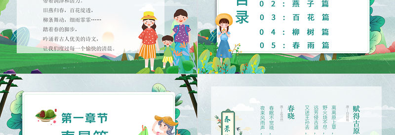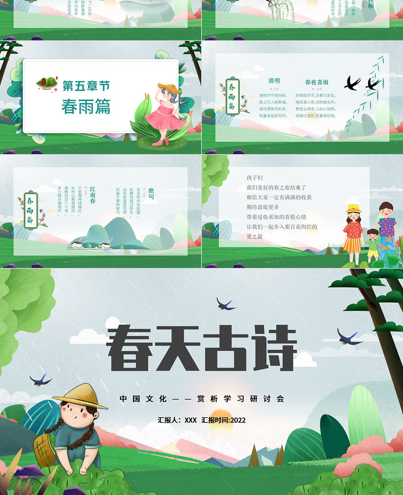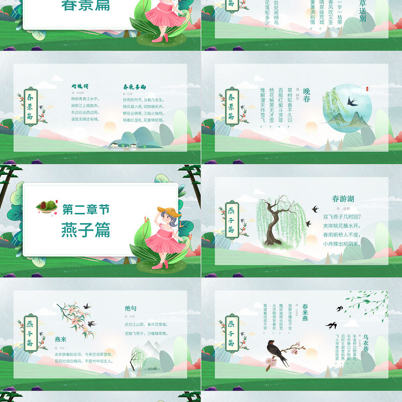 <p>中國文化——賞析學習研討會匯報人:XXX 匯報時間:2022春天古詩</p><br><p>春天緩緩地來了,帶著生機和希望,帶著潤澤和活力。舊燕歸春,百花綻透,柳條舞動,細雨霏霏……踏著春的腳步,吟誦著古人優美的詩文,讓我們度過每一個愉快的清晨。</p><br><p>目錄01:春景篇02:燕子篇04:柳樹篇03:百花篇05:春雨篇</p><br><p>春景篇</p><br><p>唐丨孟浩然賦得古原草送別唐丨白居易離離原上草,一歲一枯榮。野火燒不盡,春風吹又生。遠芳侵古道,晴翠接荒城。又送王孫去,萋萋滿別情。春曉春眠不覺曉,處處聞啼鳥。夜來風雨聲,花落知多少。</p><br><p></p><br><p>晚春 唐· 韓愈草樹知春不久歸,百般紅紫斗芳菲。楊花榆莢無才思,惟解漫天作雪飛。</p><br><p>燕子篇</p><br><p>春游湖宋 · 徐俯雙飛燕子幾時回?夾岸桃花蘸水開。春雨斷橋人不度,小舟撐出柳陰來。</p><br><p>燕來 唐 · 韋莊 去歲辭巢別近鄰,今來空訝草堂新。 花開對語應相問,不是村中舊主人。絕句唐 · 杜甫遲日江山麗,春風花草香。泥融飛燕子,沙暖睡鴛鴦。</p><br><p>春來燕 唐 · 杜荀鶴 我屋汝嫌低不住,雕梁畫閣也知寬。 大須穩擇安巢處,莫道巢成卻不安。 烏衣巷唐 · 劉禹錫朱雀橋邊野草花,烏衣巷口夕陽斜。舊時王謝堂前燕,飛入尋常百姓家。</p><br><p>百花篇</p><br><p>春日宋 · 朱熹勝日尋芳泗水濱,無邊光景一時新。等閑識得東風面,萬紫千紅總是春?;莩绱航砭八?· 蘇軾竹外桃花三兩枝,春江水暖鴨先知。蔞蒿滿地蘆芽短,正是河豚欲上時。</p><br><p>游園不值宋 葉紹翁應憐屐齒印蒼苔小扣柴扉久不開春色滿園關不住一枝紅杏出墻來大林寺桃花唐 白居易人間四月芳菲盡山寺桃花始盛開長恨春歸無覓處不知轉入此中來江南春唐 杜牧千里鶯啼綠映紅水村山郭酒旗風南朝四百八十寺多少樓臺煙雨中</p><br><p>江畔獨步尋花唐 杜甫黃四娘家花滿蹊千朵萬朵壓枝低留連戲蝶時時舞自在嬌鶯恰恰啼</p><br><p>柳樹篇</p><br><p>詠柳唐 賀知章碧玉妝成一樹高,萬條垂下綠絲絳。不知細葉誰裁出,二月春風似剪刀。雙飛燕子幾時回?夾岸桃花蘸水開。春雨斷橋人不度,小舟撐出柳陰來。雙飛燕子幾時回?夾岸桃花蘸水開。小舟撐出柳陰來。雙飛燕子幾時回?夾岸桃花蘸水開。</p><br><p>村居清 高 鼎草長鶯飛二月天拂堤楊柳醉春煙兒童散學歸來早忙趁東風放紙鳶柳唐 鄭谷半煙半雨江橋畔映杏映桃山路中會得離人無限意千絲萬絮惹春風</p><br><p>獨柳 唐 杜牧含煙一株柳拂地搖風久佳人不忍折悵望回纖手青門柳 唐 白居易 青青一樹傷心色曾入幾人離恨中為近都門多送別長條折盡減春風 </p><br><p>春雨篇</p><br><p>清明唐 杜牧清明時節雨紛紛,路上行人欲斷魂。借問酒家何處有,牧童遙指杏花村。春夜喜雨唐 杜甫好雨知時節,當春乃發生。隨風潛入夜,潤物細無聲。野徑云俱黑,江船火獨明。曉看紅濕處,花重錦官城。</p><br><p>絕句宋 志南古木陰中系短篷,杖藜扶我過橋東。沾衣欲濕杏花雨,吹面不寒楊柳風。江南春唐·杜牧千里鶯啼綠映紅,水村山郭酒旗風。南朝四百八十寺,多少樓臺煙雨中。</p><br><p>孩子們我們美好的春之旅結束了相信大家一定有滿滿的收獲期待汲取更多帶著這份求知的喜悅心情讓我們一起步入那百花絢爛的夏之篇</p><br><p>中國文化——賞析學習研討會匯報人:XXX 匯報時間:2022春天古詩</p><br>