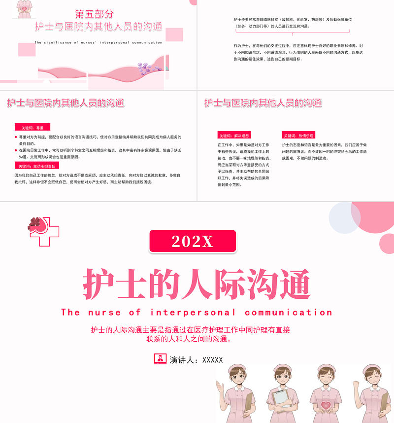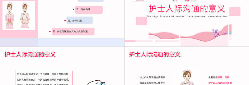 護士的人際溝通The nurse of interpersonal communication護士的人際溝通主要是指通過在醫療護理工作中同護理有直接聯系的人和人之間的溝通。202X