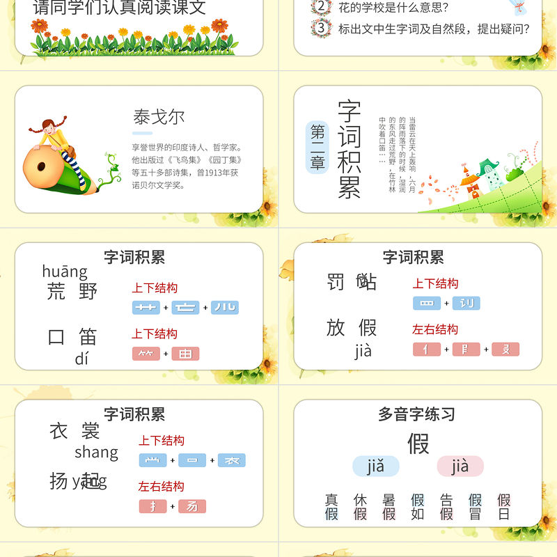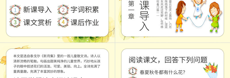 本文是選自泰戈爾《新月集》里的一首兒童散文詩。詩人以清新流暢的筆觸,勾畫出甜美純凈的兒童世界,巧妙地從孩子的眼中敘述花們的活潑、可愛、美麗、向上。全詩充滿了童真童趣,充滿了豐富其妙的想象。請同學們認真閱讀課文