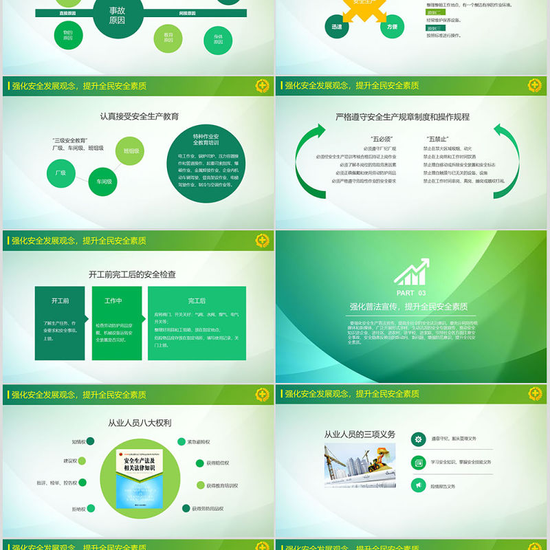 前言Introduction 以“強化安全發展觀念,提升全民安全素質”為主題,認真組織開展全國第15個“安全生產月”活動,做好新安全生產法實施周年、職業病防治法宣傳周等集中宣傳活動,強化宣傳的系統性和針對性。要樹立培訓不到位是重大安全隱患的理念,督促企業深入開展從業人員安全培訓,使大量新一代產業工人和生產經營者具備安全生產和職業病預防知識及避險逃生能力。????????要建設好安全生產網絡大學,構建隨時隨地按需學習安全知識的平臺和機制,并嚴格培訓考試,提高學習質量。?