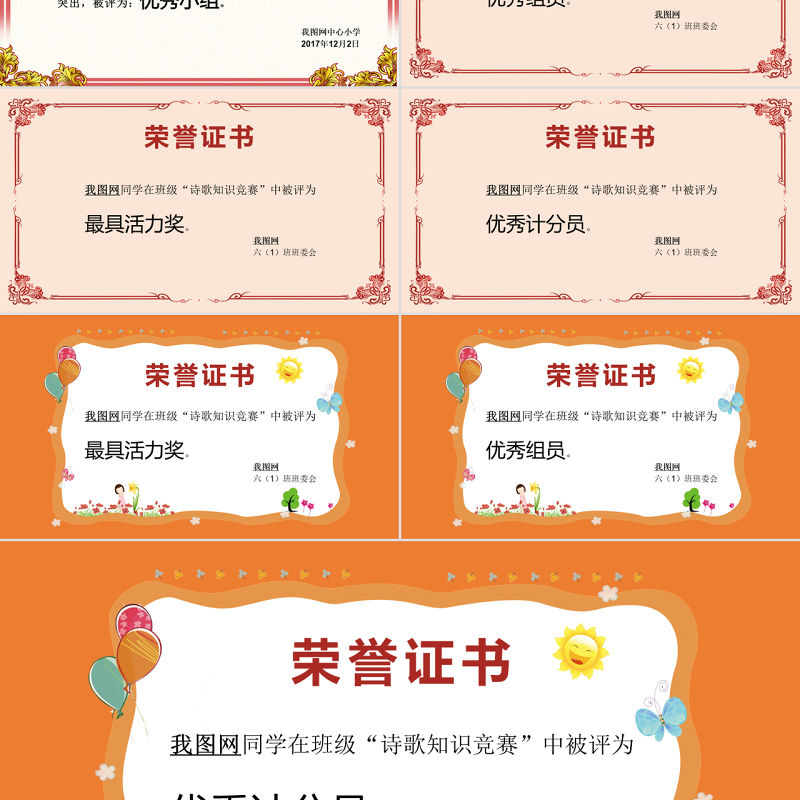 榮譽證書辦圖網同學在班級“詩歌知識競賽”中被評為最具活力獎。辦圖網六(1)班班委會