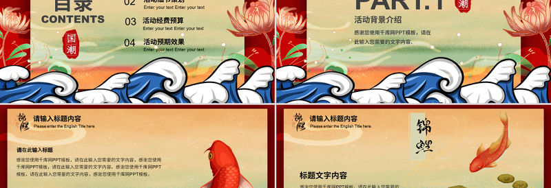 紅色,米色,創意,國潮,中式,中國風,傳統,錦鯉,插畫,手繪,活動策劃,好運,活動計劃,匯報,宣傳,商業策劃,商業計劃書,PPT,模板 Array