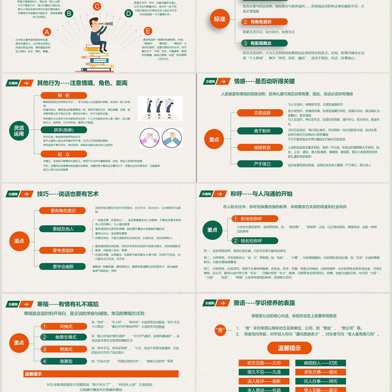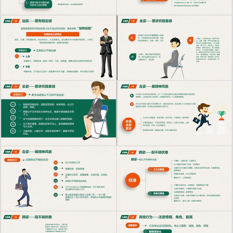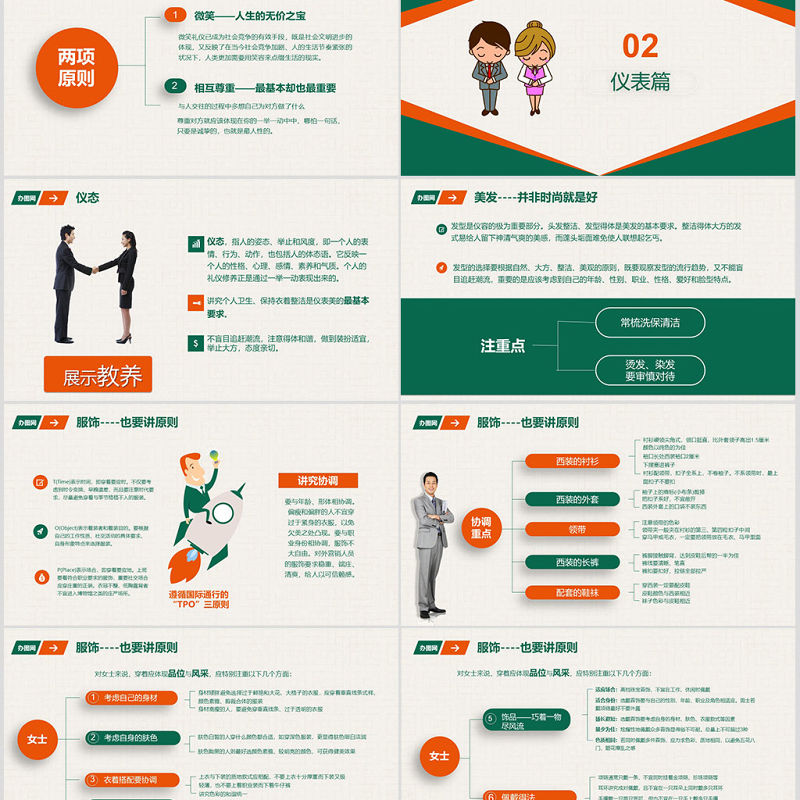 <p>職場商務禮儀培訓禮儀為重</p><br><p>目 錄CONTENTS </p><br><p>商務禮儀基本原則01</p><br><p>微笑禮儀已成為社會競爭的有效手段,既是社會文明進步的體現,又反映了在當今社會競爭加劇、人的生活節奏緊張的狀況下,人類更加需要用笑容來點綴生活的現實。與人交往的過程中多想自己為對方做了什么尊重對方就應該體現在你的一舉一動中中,哪怕一句話,只要是誠摯的,也就是最人性的。商務禮儀基本原則</p><br><p>儀表篇02</p><br><p>儀態,指人的姿態、舉止和風度,即一個人的表情、行為、動作,也包括人的體態語。它反映一個人的性格、心理、感情、素養和氣質。個人的禮儀修養正是通過一舉一動表現出來的。講究個人衛生、保持衣著整潔是儀表美的最基本要求。不盲目追趕潮流,注意得體和諧,做到裝扮適宜,舉止大方,態度親切。儀態</p><br><p>發型是儀容的極為重要部分。頭發整潔、發型得體是美發的基本要求。整潔得體大方的發式易給人留下神清氣爽的美感,而蓬頭垢面難免使人聯想起乞丐。發型的選擇要根據自然、大方、整潔、美觀的原則,既要觀察發型的流行趨勢,又不能盲目追趕潮流,重要的是應該考慮到自己的年齡、性別、職業、性格、愛好和臉型特點。注重點常梳洗保清潔燙發、染發要審慎對待美發----并非時尚就是好</p><br><p>T(Time)表示時間,即穿著要應時。不僅要考慮到時令變換、早晚溫差,而且要注意時代要求,盡量避免穿著與季節格格不入的服裝。O(Object)表示著裝者和著裝目的。要根據自己的工作性質、社交活動的具體要求、自身形象特點來選擇服裝。P(Place)表示場合,即穿著要應地。上班要著符合職業要求的服飾,重要社交場合應穿莊重的正裝。衣冠不整、低胸露背者不宜進入博物館之類的莊嚴場所。服飾----也要講原則遵循國際通行的“TPO”三原則講究協調要與年齡、形體相協調。偏瘦和偏胖的人不宜穿過于緊身的衣服,以免欠美之處凸現。要與職業身份相協調,服飾不大自由。對外營銷人員的服飾要求穩重、端莊、清爽,給人以可信賴感。</p><br><p>袖子上的商標(小布條)剪掉把扣子系好,不宜敞開西裝外套上的口袋不裝東西襯衫硬領尖角式,領口挺直,比外套領子高出1.5厘米顏色以純色的為佳袖口長處西裝袖口2厘米下擺塞進褲子襯衫配領帶,扣子全系上,不卷袖子。不系領帶時,最上面扣子不要扣注意領帶的色彩領帶夾一般夾在襯衫的第三、第四粒扣子中間穿馬甲或毛衣,一定要把領帶放在毛衣、馬甲里面褲腳接觸腳背,達到皮鞋后幫的一半為佳褲線要清晰、筆直褲扣要扣好,拉鏈全部拉嚴穿西裝一定要配皮鞋皮鞋顏色與西裝相近襪子色彩與皮鞋相近服飾----也要講原則</p><br><p>對女士來說,穿著應體現品位與風采,應特別注重以下幾個方面:套裝配高級皮鞋,運動裝配旅游鞋等服飾----也要講原則</p><br><p>對女士來說,穿著應體現品位與風采,應特別注重以下幾個方面:項鏈通常只戴一條,不宜同時掛著金項鏈、珍珠項鏈等耳環講究成對佩戴,且不宜在一只耳朵上同時戴多只耳環手鐲戴一只兩只皆可,但也不宜在一只手上戴多只手鐲手鏈通常只在左手上戴一條,不宜雙手同時戴手鏈胸針通常別在西裝左側領上或左側胸前適應場合:高檔珠寶首飾,不宜在工作、休閑時佩戴適合身份:選戴首飾要與自己的性別、年齡、職業及角色相適應。男士若戴項鏈最好不要外露揚長避短:選戴首飾要考慮自身的身材、膚色、衣服款式等因素量少為佳:炫耀性地佩戴眾多首飾顯得俗不可耐。總量上不可超過3種色質相同:若同時佩戴多件首飾,應力求色彩、質地相同,以避免五花八門、眼花繚亂之感服飾----也要講原則</p><br><p>歪著脖子、斜著肩或一肩高一肩低、弓背、挺著腹、撅臀或身體依靠其他物體等最容易表現體態特征的是人處于站立時的姿勢。要求做到“站有站相”正確的站立姿勢應上身(1)兩腿彎曲、叉開很大以及在一般情境中雙手叉腰、雙臂抱在胸前、兩手插在口袋等手腳(2)端正、莊重,具有穩定性。站立時的人,從正面看去,應以鼻為點與地面作垂直狀,人體在垂直線的兩側對稱,表情自然明朗站姿----要有穩定感</p><br><p>坐姿是人際交往中最重要的人體姿態,它反映的信息非常豐富。優美的坐姿是端正、優雅、自然、大方入座時,要走到座位前面再轉身,然后右腳向后退半步,再輕穩地坐下,收右腳入座后,上體自然坐直,雙肩平正放松,立腰、挺胸,兩手放在雙膝上或兩手交叉半握拳放在腿上,亦可兩臂微屈,掌心向下,放在桌上。兩腿自然彎曲,雙腳平落地上,男士雙膝稍稍分開,女士雙膝必須靠緊,兩腳平行,臀部坐在椅子的中央(男士可坐滿椅子,背輕靠椅背)。雙目平視,嘴唇微閉,微收下頜,面帶笑容。起立時,右腳向后退半步,而后直立站起,收右腳坐姿----要講究穩重感</p><br><p>坐姿----要講究穩重感(1)就座時前傾后仰,或是歪歪扭扭,脊背彎曲,頭過于前傾,聳肩。(2)兩腿過于叉開或長長地伸出去,萎靡不振地癱坐在椅子上。(3)坐下后隨意挪動椅子,在正式場合蹺二郎腿時搖腿。(4)為了表示謙虛,故意坐在椅子邊上,身體萎縮前傾地與人交談。(5)大腿并攏,小腿分開,或雙手放在臀下,腿腳不停地抖動。</p><br><p>行走是人生活中的主要動作。從一個人的走姿就可以看出其精神是奮發進取或失意懶散,以及是否受人歡迎等,它最能體現出一個人的精神面貌。在生活中
