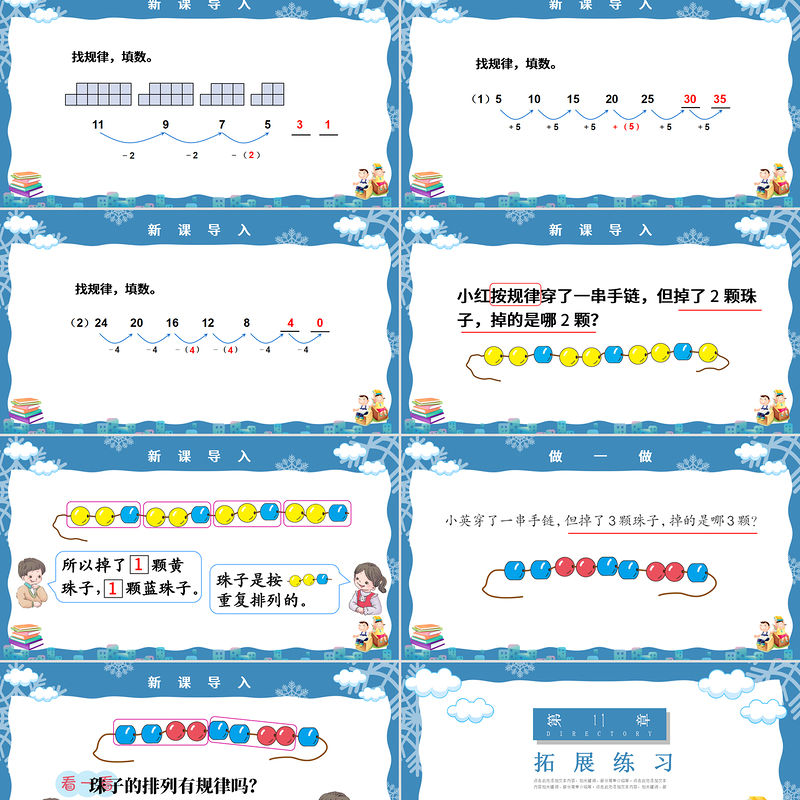 新課導入 珠子的排列有規律嗎?所以掉了1顆藍珠子,2顆紅珠子。