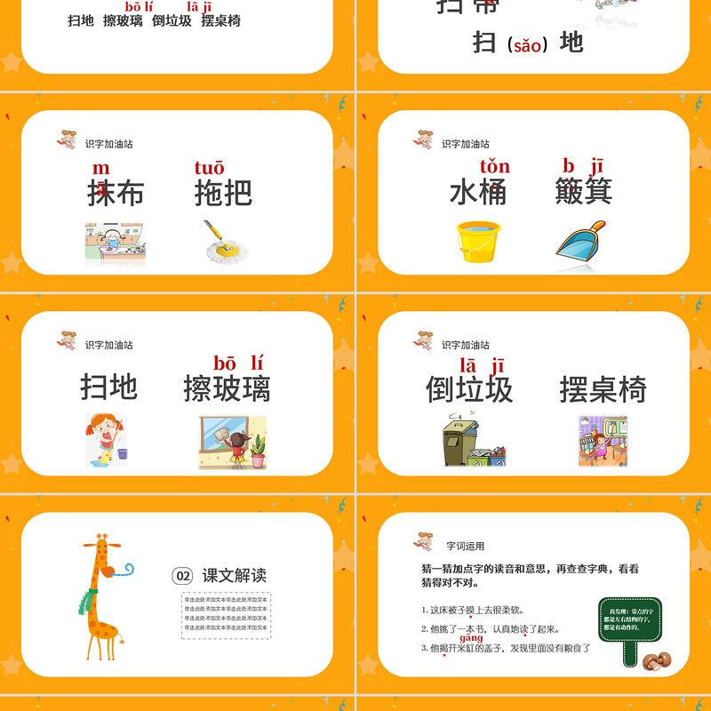 掃帚 抹布 拖把 水桶 簸箕掃地 擦玻璃 倒垃圾 擺桌椅sàozhǒumātuōtǒnɡbòjībōlílājī識字加油站