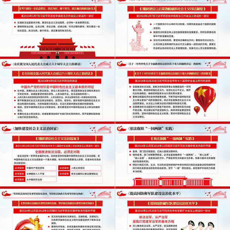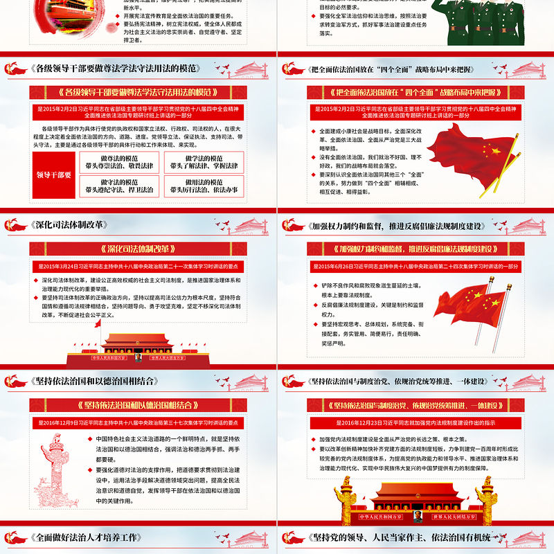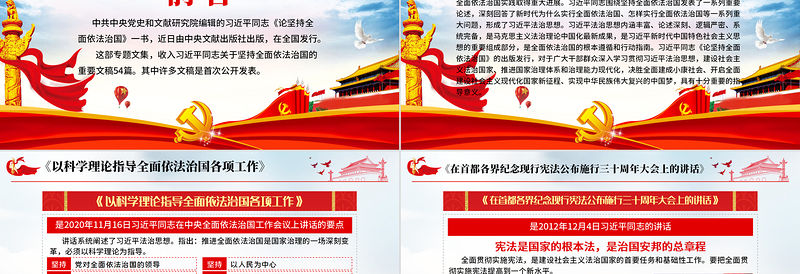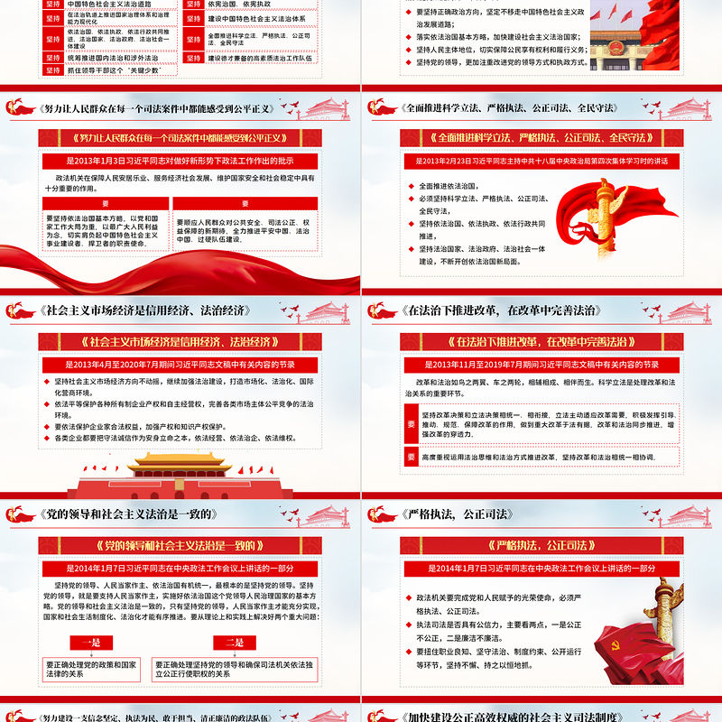 《全面推進科學立法、嚴格執法、公正司法、全民守法》全面推進依法治國,必須堅持科學立法、嚴格執法、公正司法、全民守法,堅持依法治國、依法執政、依法行政共同推進,堅持法治國家、法治政府、法治社會一體建設,不斷開創依法治國新局面。是2013年2月23日同志主持中共十八屆中央政治局第四次集體學習時的講話