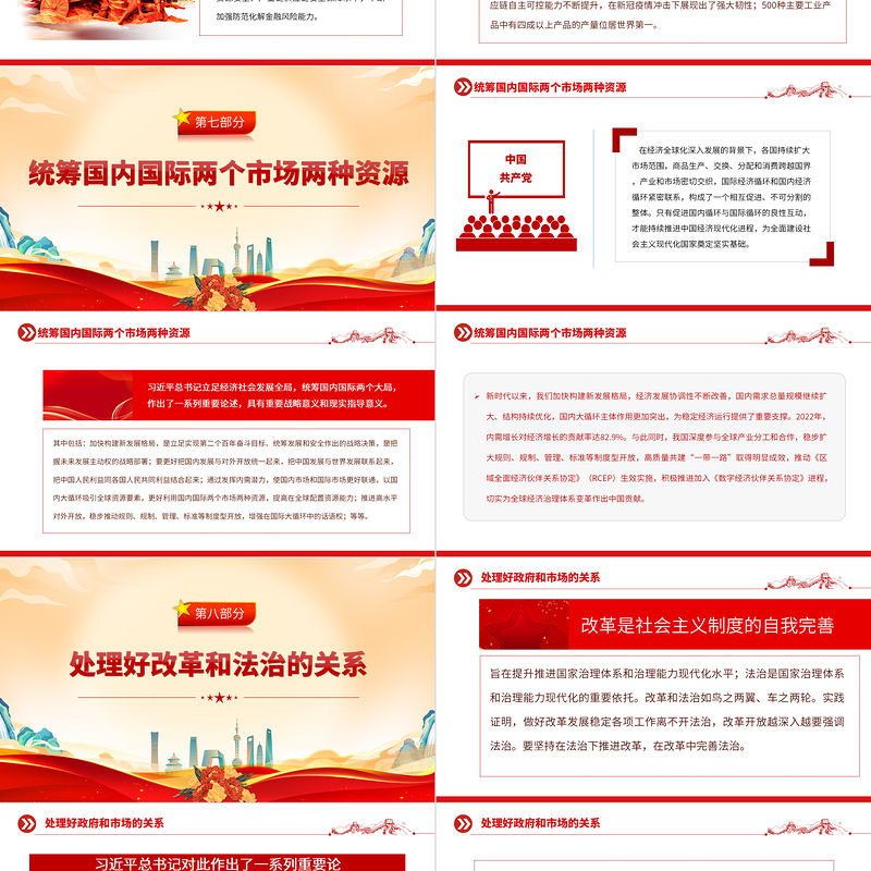 習近平總書記對政府和市場關系問題作出了一系列重要論述。其中包括:要堅持社會主義市場經濟改革方向,堅持辯證法、兩點論,繼續在社會主義基本制度與市場經濟的結合上下功夫,把兩方面優勢都發揮好;1深化要素市場化改革,建設高標準市場體系;加快建設高效規范、公平競爭、充分開放的全國統一大市場,建立全國統一的市場制度規則,促進商品要素資源在更大范圍內暢通流動;等等。