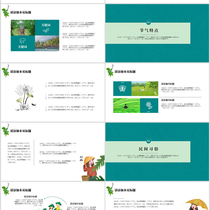 谷雨是二十四節氣的第六個節氣,也是春季最后一個節氣,每年4月19日~21日時太陽到達黃經30°時為谷雨,源自古人“雨生百谷”之說。谷雨是二十四節氣的第六個節氣,也是春季最后一個節氣,每年4月19日~21日時太陽到達黃經30°時為谷雨,源自古人“雨生百谷”之說。谷雨是二十四節氣的第六個節氣,也是春季最后一個節氣,每年4月19日~21日時太陽到達黃經30°時為谷雨,源自古人“雨生百谷”之說。請添加小標題請添加小標題請添加小標題
