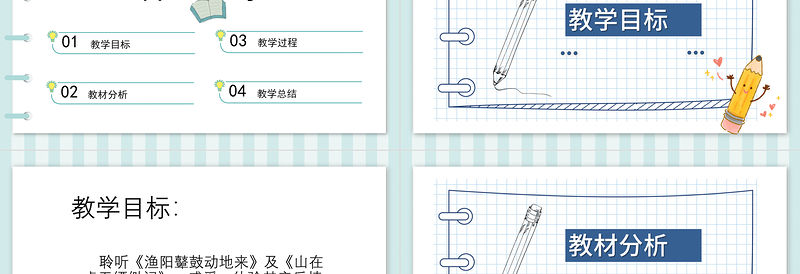 教學目標: 聆聽《漁陽鼙鼓動地來》及《山在虛無縹緲間》,感受、體驗其音樂情緒,理解其所反映的社會現(xiàn)實。