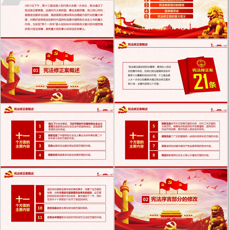 前 言PREFACE3月11日下午,第十三屆全國人民代表大會第一次會議,表決通過了憲法修正案草案。這是時代大勢所趨、事業發展所需、黨心民心所向,是推進全面依法治國、推進國家治理體系和治理能力現代化的重大舉措,對更好發揮憲法在新時代堅持和發展中國特色社會主義中的重大作用,為實現“兩個一百年”奮斗目標和中華民族偉大復興的中國夢提供有力憲法保障,具有重大現實意義和深遠歷史意義。
