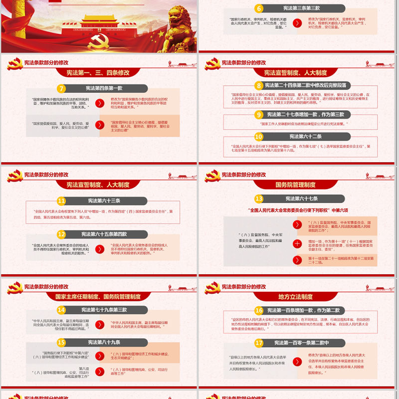 憲法條款部分的修改憲法宣誓制度、人大制度“國家倡導社會主義核心價值觀,提倡愛祖國、愛人民、愛勞動、愛科學、愛社會主義的公德,在人民中進行愛國主義、集體主義和國際主義、共產主義的教育,進行辯證唯物主義和歷史唯物主義的教育,反對資本主義的、封建主義的和其他的腐朽思想?!薄皣夜ぷ魅藛T就職時應當依照法律規定公開進行憲法宣誓?!薄叭珖嗣翊泶髸惺瓜铝新殭唷敝性黾右豁棧鳛榈谄唔棥埃ㄆ撸┻x舉國家監察委員會主任”,第七項至第十五項相應改為第八項至第十六項。