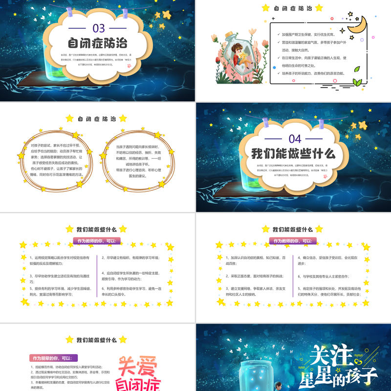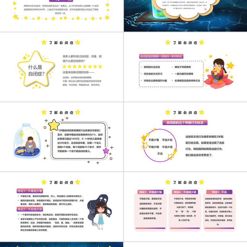 工圖網提供2022關注星星的孩子PPT卡通風關愛自閉癥患者創造健康世界主題班會課件模板供會員免費下載。更多精彩黨課PPT素材,盡在工圖網。