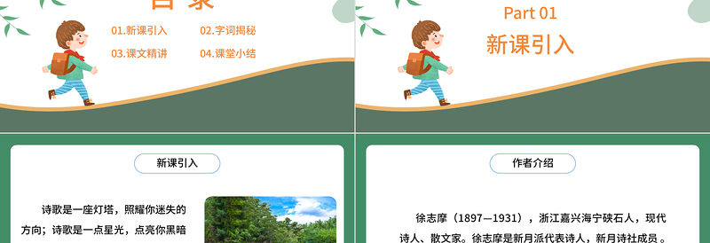 作者介紹 徐志摩(1897—1931),浙江嘉興海寧硤石人,現代詩人、散文家。徐志摩是新月派代表詩人,新月詩社成員 。代表作品有《再別康橋》《翡冷翠的一夜》等。