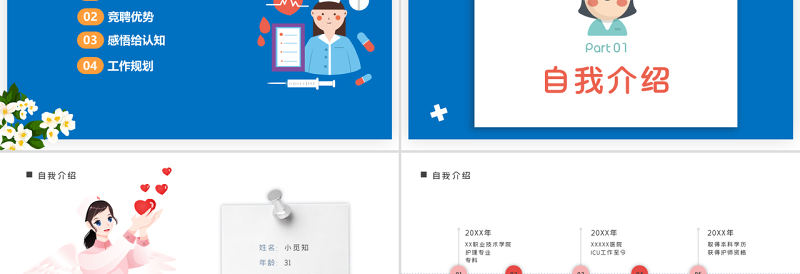 010203040520XX年XX職業技術學院護理專業專科20XX年XX市第一人民醫院實習20XX年XXXXX醫院ICU工作至今20XX年被選送至XX省省立醫院進修重癥護理專業20XX年取得本科學歷獲得護師資格自我介紹