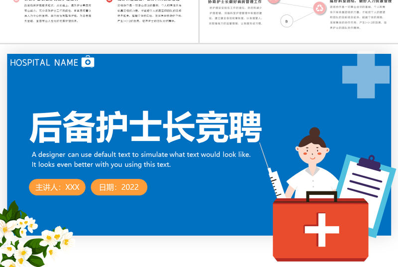 后備護士長競聘A designer can use default text to simulate what text would look like. It looks even better with you using this text. 主講人:XXX日期:2022HOSPITAL NAME