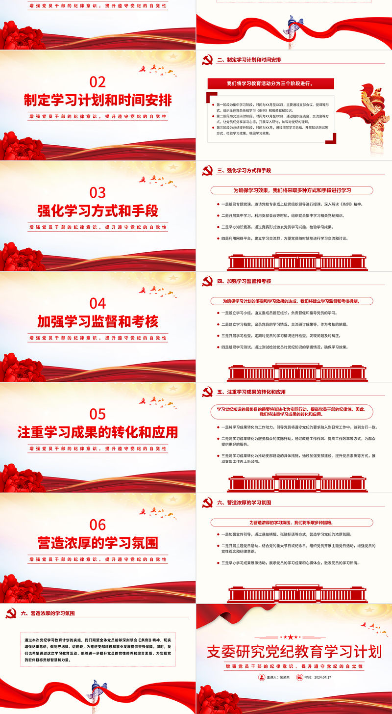 六、營造濃厚的學習氛圍一是加強宣傳引導,通過懸掛橫幅、張貼標語等方式,營造學習黨紀的濃厚氛圍。 二是開展主題黨日活動,結合黨的重大節日或紀念日,組織黨員開展主題黨日活動,增強黨員的黨性觀念和紀律意識。 三是舉辦學習成果展示活動,展示黨員的學習成果和心得體會,激發黨員的學習熱情。
