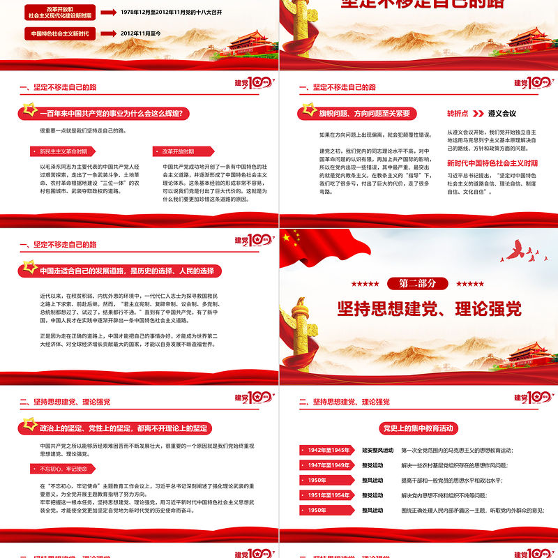 一、堅定不移走自己的路如果在方向問題上出現偏離,就會犯顛覆性錯誤。建黨之初,我們黨內的同志理論水平不高,對中國革命問題的認識有限,再加上共產國際的影響,所以在黨內出現一些錯誤,其中最嚴重、最突出的就是黨內教條主義。在教條主義的“指導”下,我們吃了很多虧,付出了巨大的代價,走了很多彎路。轉折點遵義會議從遵義會議開始,我們黨開始獨立自主地運用馬克思列寧主義基本原理解決自己的路線、方針和政策方面的問題。新時代中國特色社會主義時期提出,“堅定對中國特色社會主義的道路自信、理論自信、制度自信、文化自信”。