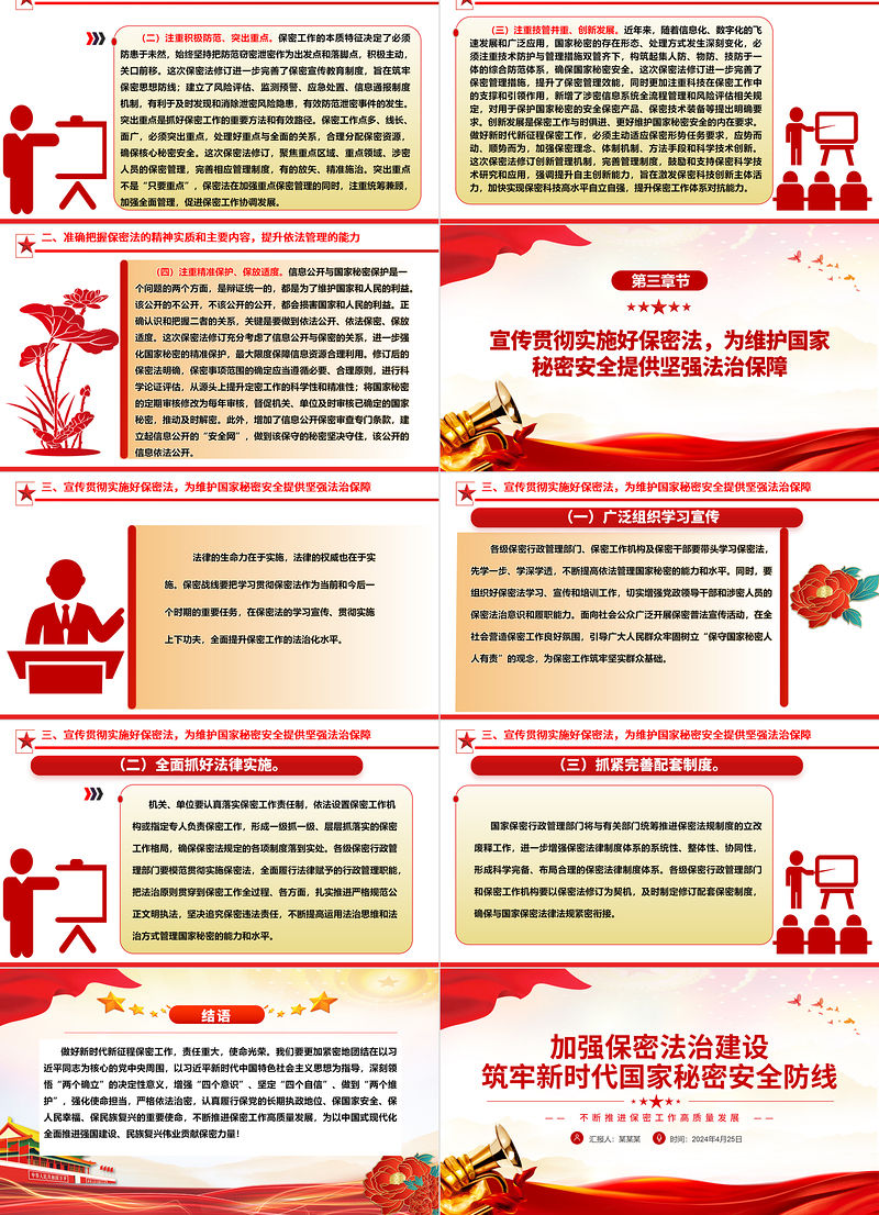 結(jié)語 做好新時代新征程保密工作,責任重大,使命光榮。我們要更加緊密地團結(jié)在以習近平同志為核心的黨中央周圍,以習近平新時代中國特色社會主義思想為指導,深刻領悟“兩個確立”的決定性意義,增強“四個意識”、堅定“四個自信”、做到“兩個維護”,強化使命擔當,嚴格依法治密,認真履行保黨的長期執(zhí)政地位、保國家安全、保人民幸福、保民族復興的重要使命,不斷推進保密工作高質(zhì)量發(fā)展,為以中國式現(xiàn)代化全面推進強國建設、民族復興偉業(yè)貢獻保密力量!