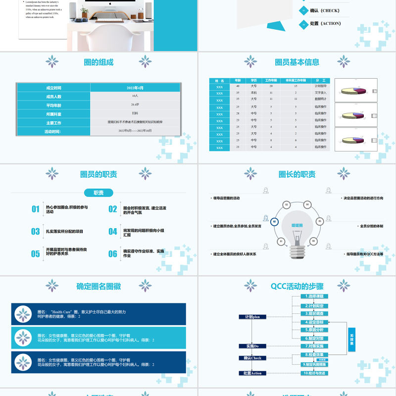 圈員的職責(zé)職責(zé)01熱心參加圈會(huì),積極的參與活動(dòng) 02圈會(huì)時(shí)積極發(fā)言, 建立活潑的開會(huì)氣氛 03扎實(shí)落實(shí)所分配的項(xiàng)目04將發(fā)現(xiàn)的問題積極向小組匯報(bào) 05開展品管時(shí)與患者保持良好的護(hù)患關(guān)系 06確實(shí)遵守作業(yè)標(biāo)準(zhǔn)、實(shí)施作業(yè)