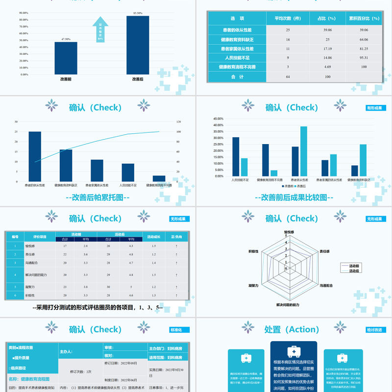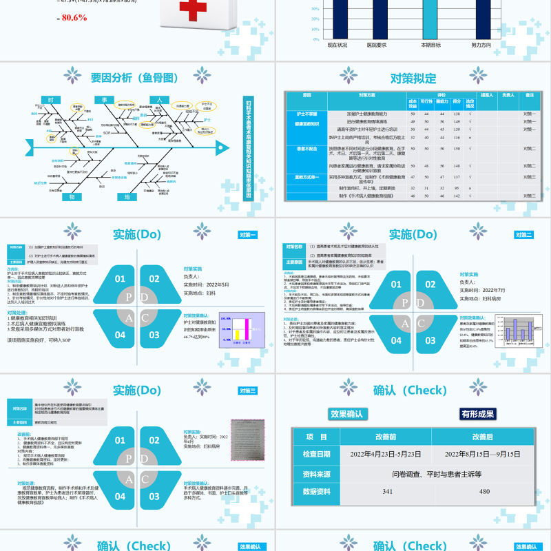 實(shí)施(Do)對策二01020403對策實(shí)施負(fù)責(zé)人:實(shí)施時(shí)間:2022年7月實(shí)施地點(diǎn):婦科病房對策效果確認(rèn):患者及家屬對健康教育的依從性由52.6%提高到92.6%,健康教育知識(shí)的知曉率也由原來的45.3%提高至80.6%對策處理:1、 責(zé)任護(hù)士加強(qiáng)對患者及家屬的健康宣教力度;2、及時(shí)跟蹤督導(dǎo)患者對所宣教內(nèi)容的落實(shí)情況3、對于患者及家屬的操作內(nèi)容,應(yīng)及時(shí)讓患者及家屬反饋示范,護(hù)士檢查正確性。4、對于學(xué)歷較低、溝通能力差的患者,責(zé)任護(hù)士會(huì)有針對性地增加宣教次數(shù)等P DA C改善前:1、術(shù)前因醫(yī)患溝通障礙,患者無按時(shí)服用降血壓藥物、未按要求禁食禁飲等,導(dǎo)致手術(shù)延遲;2、術(shù)后患者因害怕疼痛等原因未盡早下床活動(dòng),導(dǎo)致肛門排氣延遲、術(shù)后雙下肢靜脈血栓、術(shù)后康復(fù)延遲等對策內(nèi)容:1、手術(shù)前及術(shù)后,用口頭、書面和多媒體視頻等宣教方式向患者及家屬進(jìn)行術(shù)前教育;2、責(zé)任護(hù)士及時(shí)督導(dǎo)患者落實(shí);3、術(shù)后麻醉清醒后囑患者盡早下床活動(dòng),指導(dǎo)飲食;4、責(zé)任護(hù)士將宣教內(nèi)容落實(shí)到位并定時(shí)跟蹤,確保宣教效果