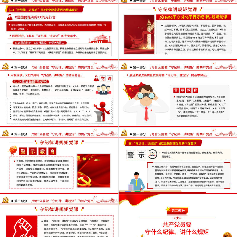 (二)“守紀律、講規矩”是X安全穩定發展的根本保證X是國民經濟的XX的先行官在經濟社會發展中具有重要作用。無論是過去、現在還是未來,X安全穩定發展都需要我們做到“守紀律、講規矩”。回顧過往,X具有“守紀律、講規矩”的光榮歷史。在大革命前夕,X舉行震驚中外的X大罷工抗日戰爭中,建立了X隊等多個X抗日武裝隊伍,積極投身抗日救亡運動和民族解放戰爭。解放戰爭中,X人發出了“解放軍打到哪里,X就修到哪里”的豪邁誓言,為解放戰爭勝利做出了重要貢獻。