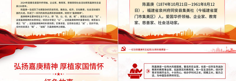 工圖網提供弘揚嘉庚精神厚植家國情懷PPT精美簡潔紀念陳嘉庚先生誕辰150周年微課堂供會員免費下載。更多精彩黨課PPT素材,盡在工圖網。