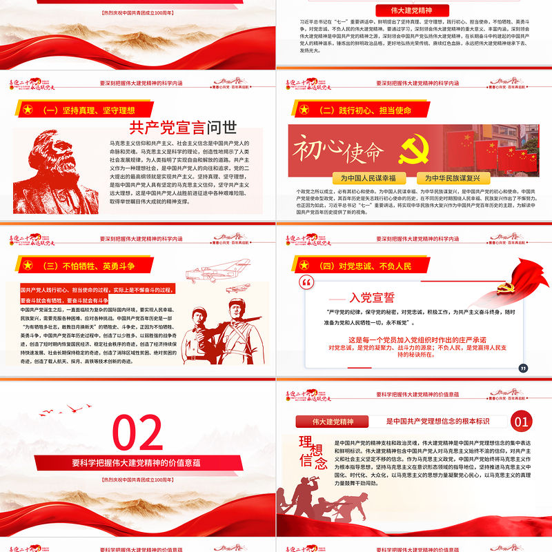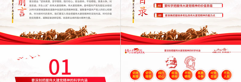 PREFACE前言 習近平總書記在慶祝中國共產黨成立100周年大會上,追溯我們黨的精神之源,首次提出“堅持真理、堅守理想,踐行初心、擔當使命,不怕犧牲、英勇斗爭,對黨忠誠、不負人民”的偉大建黨精神。偉大建黨精神,是中國共產黨先驅在20世紀20年代探索救國救民道路中創造的寶貴精神財富,凝聚著中國共產黨人的初心和使命。作為新時代的青年,我們要深入領會把握偉大建黨精神的深刻內涵、時代價值和實踐要求,凝聚起奮進新征程、創造新業績的強大精神力量。
