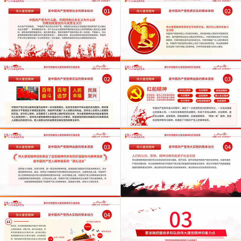 要科學把握偉大建黨精神的價值意蘊紅船精神開天辟地、敢為人先的首創精神堅定理想、百折不撓的奮斗精神立黨為公、忠誠為民的奉獻精神 中國共產黨百年奮斗歷程中,涌現了一大批視死如歸的革命烈士、一大批頑強奮斗的英雄人物、一大批忘我奉獻的先進模范,形成了井岡山精神、長征精神、遵義會議精神、延安精神、西柏坡精神、抗美援朝精神、“兩彈一星”精神、脫貧攻堅精神等偉大精神,構建起了中國共產黨人的精神譜系。