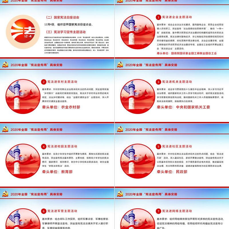 2020年全國“憲法宣傳周”具體安排憲法進網絡主題活動7基本要求:組織網絡媒體策劃開展形式多樣的憲法宣傳活動,促進憲法精神的網絡傳播。在網絡視聽機構播出憲法宣傳公益廣告。牽頭單位:中央網信辦 國家廣播電視總局各地各部門要參照本方案策劃制定當地“憲法宣傳周”活動方案,統籌各部門和社會各方力量,形成良好的宣傳整體效果。