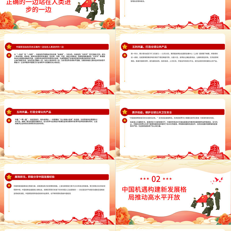 CONTENTS目 錄中國(guó)擔(dān)當(dāng)站在歷史正確的一邊站在人類(lèi)進(jìn)步的一邊中國(guó)機(jī)遇構(gòu)建新發(fā)展格局推動(dòng)高水平開(kāi)放中國(guó)理念共建開(kāi)放型世界經(jīng)濟(jì)構(gòu)建人類(lèi)命運(yùn)共同體