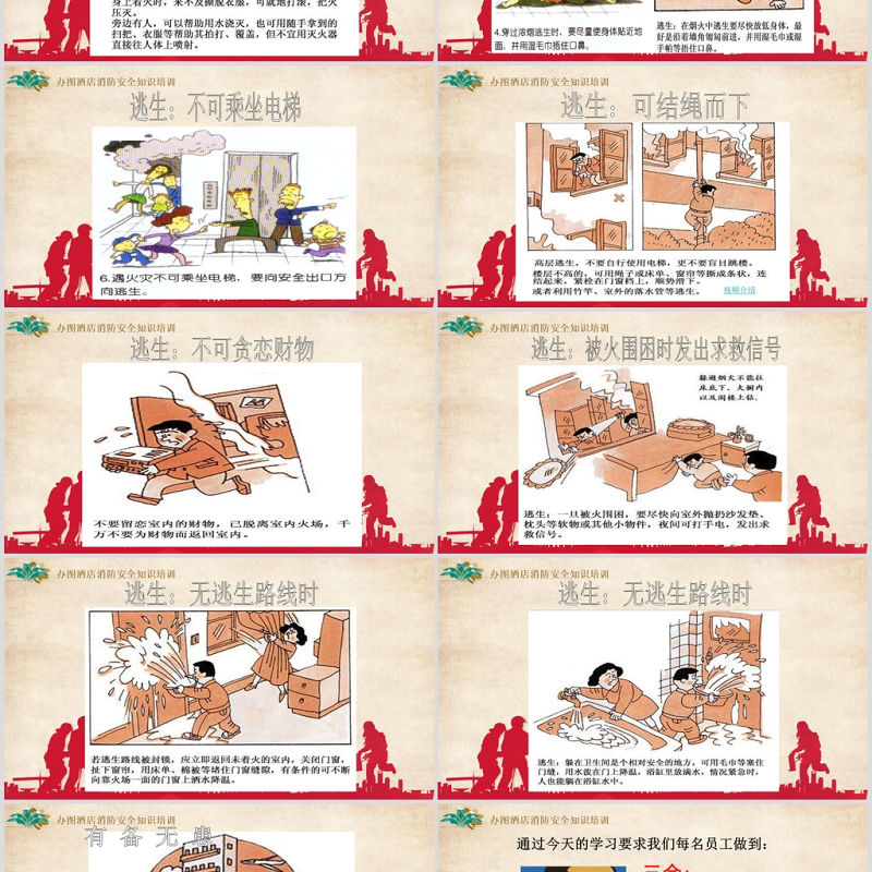 結(jié)束語(yǔ): 酒店屬于公共場(chǎng)所人員密集單位,也屬消防安全防范重點(diǎn)單位。在日常工作、生活中因人的不安全因素和物的不安全狀態(tài),往往會(huì)出現(xiàn)初期消防火險(xiǎn),如火險(xiǎn)周邊人員能熟練掌握初期火險(xiǎn)撲救方法,就可將隱患消除在萌芽狀態(tài)。為保障人員人身安全、財(cái)產(chǎn)安全,全員必須參與消防工作管理,通過(guò)對(duì)消防基礎(chǔ)知識(shí)、疏散演練、滅火演練等方面的培訓(xùn),保障酒店內(nèi)人員在意外事件中多一份平安!