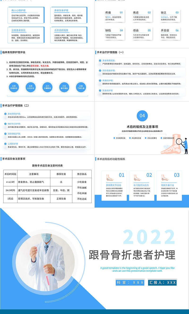 跟骨骨折患者護理A good template is the beginning of a good speech. I hope you like and can use this presentation template well. 2022匯報人:XXX科室:XXX