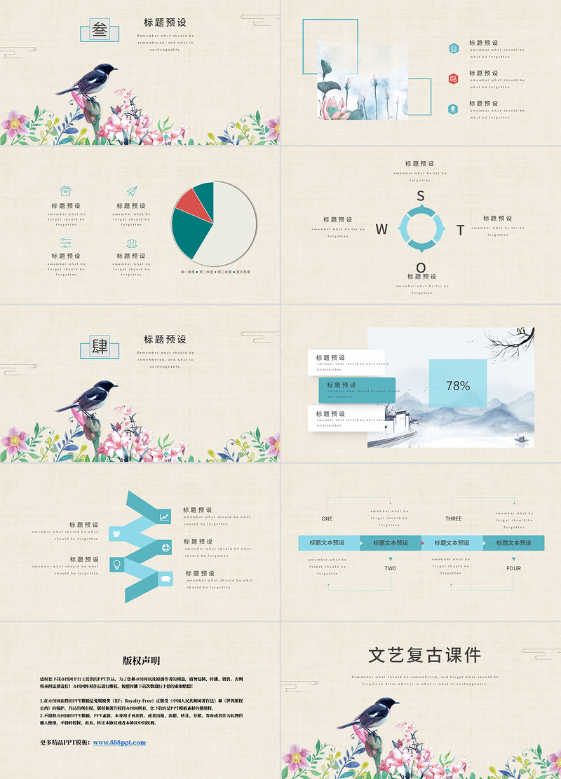 版權聲明感謝您下載辦圖網平臺上提供的PPT作品,為了您和辦圖網以及原創作者的利益,請勿復制、傳播、銷售,否則將承擔法律責任!辦圖網將對作品進行維權,按照傳播下載次數進行十倍的索取賠償!1.在辦圖網出售的PPT模板是免版稅類(RF:Royalty-Free)正版受《中國人民共和國著作法》和《世界版權公約》的保護,作品的所有權、版權和著作權歸辦圖網所有,您下載的是PPT模板素材的使用權。2.不得將辦圖網的PPT模板、PPT素材,本身用于再出售,或者出租、出借、轉讓、分銷、發布或者作為禮物供他人使用,不得轉授權、出賣、轉讓本協議或者本協議中的權利。更多精品PPT模板:www.888ppt.com