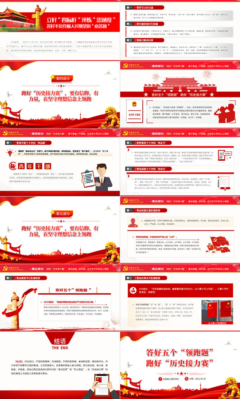 同志們,風(fēng)云變幻,不變的是精神;滄海桑田,不老的是青春。奮進新征程、建功新時代,作為年輕干部要牢記黨的教誨、立志民族復(fù)興,在青春的賽道上奮力奔跑,成為擔(dān)當(dāng)者、奮斗者、奉獻者、開拓者,把自己真正鍛造成為新時代的“疾風(fēng)勁草”和“烈火真金”,在“歷史接力賽”的如虹賽道上為黨和人民爭取更大榮光。結(jié)語THE END