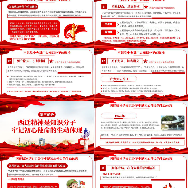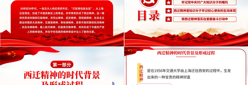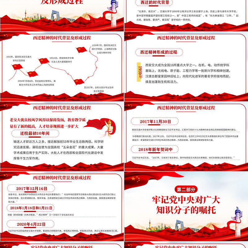 前 言20世紀(jì)50年代,一批交大人響應(yīng)黨的號召,“打起背包就出發(fā)”,從上海遷至西安,創(chuàng)造了中國高教史上的奇跡,并孕育和形成了西遷精神。這一精神同革命時期的紅船精神、井岡山精神、延安精神、西柏坡精神,社會主義建設(shè)時期的大慶精神、紅旗渠精神、焦裕祿精神,改革開放時期的抗洪精神、抗擊非典精神、載人航天精神、抗震救災(zāi)精神等,共同形成了中國共產(chǎn)黨人的精神譜系,并在中華民族的精神脊梁中注入了新的元素。