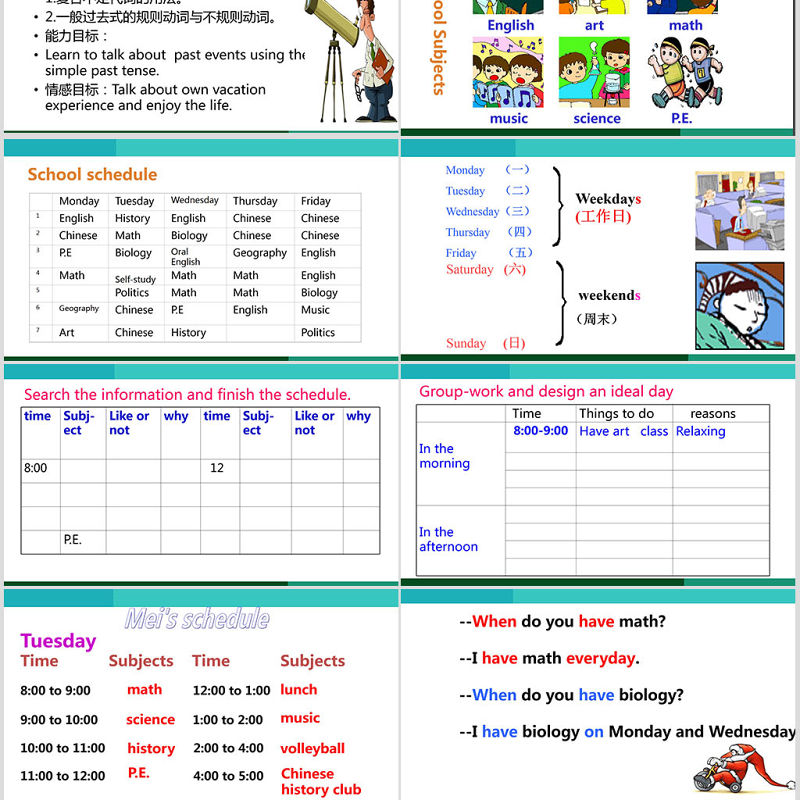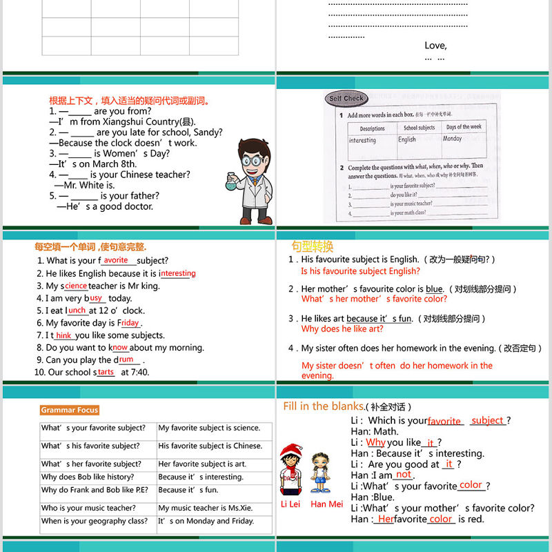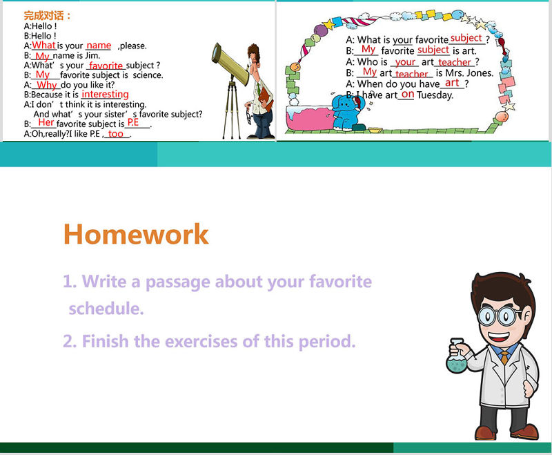 A: What is your favorite subject?B: My favorite subject is …A:When do you have…B: We have…on…A: Why do you like …?B: Because I think it’s …A: Who is your … teacher?B: My … teacher is Mr. / Mrs. /Miss / Ms …Ask and answer in pairs: