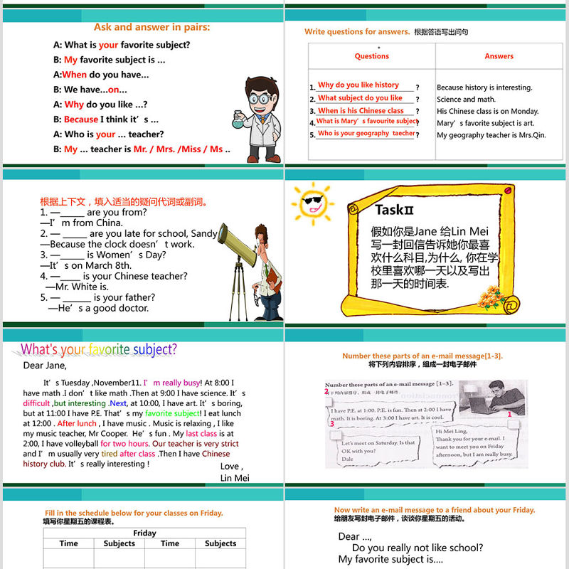 假如你是Jane 給Lin Mei 寫一封回信告訴她你最喜歡什么科目,為什么, 你在學校里喜歡哪一天以及寫出那一天的時間表.TaskⅡ