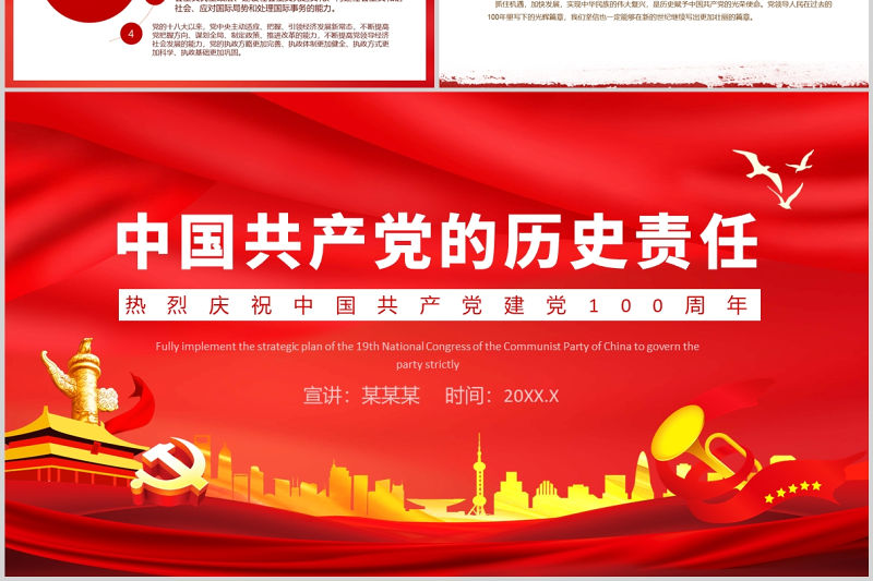 熱烈慶祝中國共產黨建黨100周年Fully implement the strategic plan of the 19th National Congress of the Communist Party of China to govern the party strictly宣講:某某某 時間:20XX.X中國共產黨的歷史責任