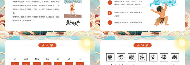 認(rèn)識(shí)7個(gè)生字,會(huì)寫(xiě)13個(gè)生字,能正確讀寫(xiě)“緩緩、精疲力竭”等詞語(yǔ)。有感情地朗讀課文,明確盤(pán)古開(kāi)天地的過(guò)程。感受盤(pán)古敢于開(kāi)創(chuàng),勇于獻(xiàn)身的精神。123
