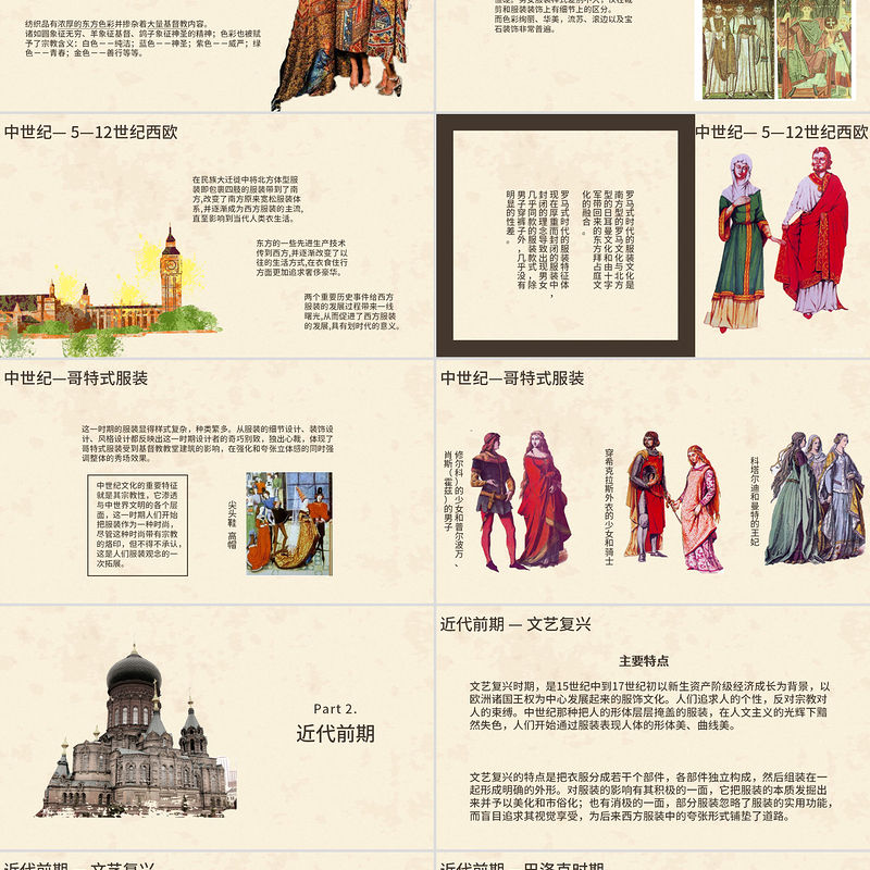近代前期 — 文藝復(fù)興文藝復(fù)興時(shí)期,是15世紀(jì)中到17世紀(jì)初以新生資產(chǎn)階級(jí)經(jīng)濟(jì)成長(zhǎng)為背景,以歐洲諸國(guó)王權(quán)為中心發(fā)展起來(lái)的服飾文化。人們追求人的個(gè)性,反對(duì)宗教對(duì)人的束縛。中世紀(jì)那種把人的形體層層掩蓋的服裝,在人文主義的光輝下黯然失色,人們開(kāi)始通過(guò)服裝表現(xiàn)人體的形體美、曲線(xiàn)美。文藝復(fù)興的特點(diǎn)是把衣服分成若干個(gè)部件,各部件獨(dú)立構(gòu)成,然后組裝在一起形成明確的外形。對(duì)服裝的影響有其積極的一面,它把服裝的本質(zhì)發(fā)掘出來(lái)并予以美化和市俗化;也有消極的一面,部分服裝忽略了服裝的實(shí)用功能,而盲目追求其視覺(jué)享受,為后來(lái)西方服裝中的夸張形式鋪墊了道路。主要特點(diǎn)
