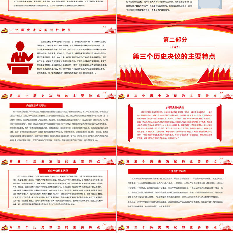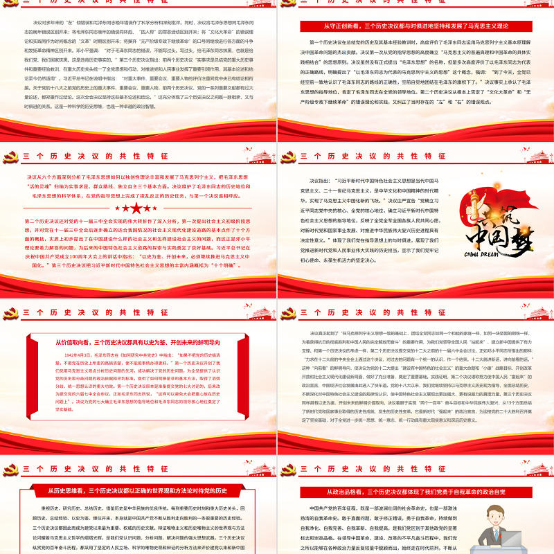 三個(gè)歷史決議的共性特征決議從六個(gè)方面深刻分析了毛澤東思想如何以獨(dú)創(chuàng)性理論豐富和發(fā)展了馬克思列寧主義,把毛澤東思想“活的靈魂”歸納為實(shí)事求是、群眾路線、獨(dú)立自主三個(gè)基本方面。決議維護(hù)了毛澤東同志的歷史地位和毛澤東思想的科學(xué)體系,在黨的指導(dǎo)思想上完成了撥亂反正的歷史任務(wù),與第一個(gè)決議遙相呼應(yīng)。第二個(gè)歷史決議還對(duì)黨的十一屆三中全會(huì)實(shí)現(xiàn)的偉大轉(zhuǎn)折作了深入分析,第一次提出社會(huì)主義初級(jí)階段思想,并對(duì)黨在十一屆三中全會(huì)后逐步確立的適合我國(guó)情況的社會(huì)主義現(xiàn)代化建設(shè)道路的基本點(diǎn)作了十個(gè)方面的概括,實(shí)質(zhì)上初步提出了在中國(guó)建設(shè)什么樣的社會(huì)主義和怎樣建設(shè)社會(huì)主義的問題,而這正是鄧小平理論要著力解答的問題,為后來的中國(guó)特色社會(huì)主義道路的探索與實(shí)踐奠定了良好基礎(chǔ)。習(xí)近平總書記在慶祝中國(guó)共產(chǎn)黨成立100周年大會(huì)上的講話中指出:“以史為鑒、開創(chuàng)未來,必須繼續(xù)推進(jìn)馬克思主義中國(guó)化。”第三個(gè)歷史決議把習(xí)近平新時(shí)代中國(guó)特色社會(huì)主義思想的豐富內(nèi)涵概括為“十個(gè)明確”。