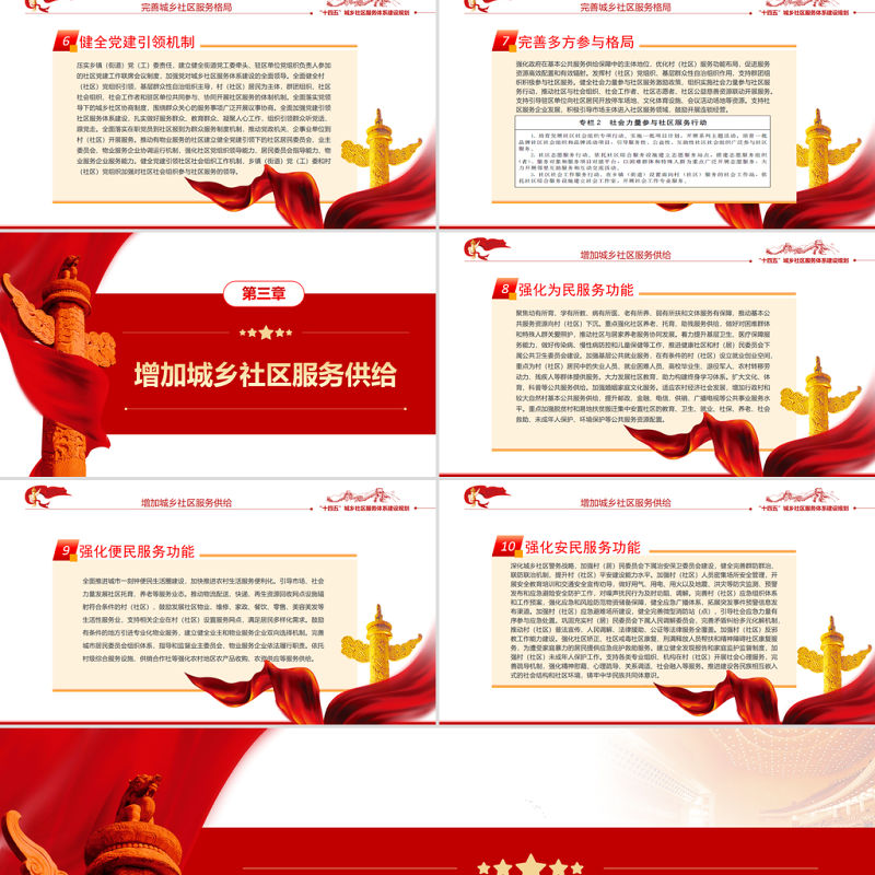 譜寫城鄉(xiāng)社區(qū)服務(wù)體系建設(shè)新篇章以習(xí)近平新時(shí)代中國(guó)特色社會(huì)主義思想為指導(dǎo),全面貫徹黨的十九大和十九屆歷次全會(huì)精神,堅(jiān)持和加強(qiáng)黨的全面領(lǐng)導(dǎo),堅(jiān)持以人民為中心,以增進(jìn)人民福祉為出發(fā)點(diǎn)和落腳點(diǎn),以強(qiáng)化為民、便民、安民功能為重點(diǎn),以不斷滿足人民高品質(zhì)生活需求為目標(biāo),加快完善黨建引領(lǐng)社區(qū)服務(wù)體系建設(shè),增加服務(wù)供給,補(bǔ)齊服務(wù)短板,創(chuàng)新服務(wù)機(jī)制,為推進(jìn)基層治理體系和治理能力現(xiàn)代化建設(shè)奠定堅(jiān)實(shí)基礎(chǔ),讓人民生活更加美好,讓基層更加和諧穩(wěn)定,讓黨的執(zhí)政基礎(chǔ)更加穩(wěn)固。